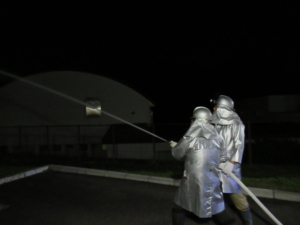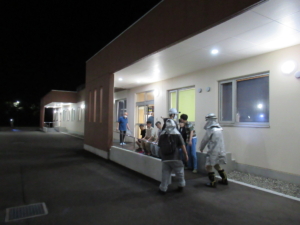 秋の合同災害訓練は夜間出火を想定し、各施設間の連携などを中心に訓練しています。