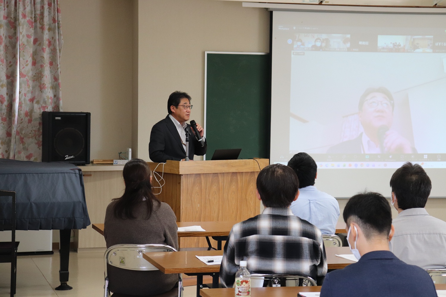 11月14日(金)、今年度の後期現任職員研修会を開催しました。地域交流ホーム「夢」を会場とする対面開催と併せて、オンラインでも参加できるハイブリッド形式で実施しました。