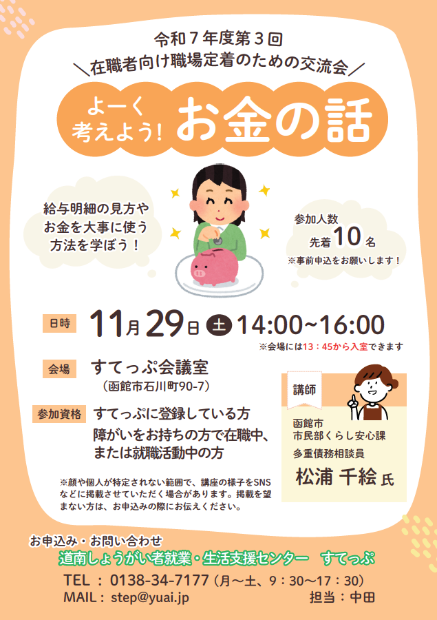 今回の講座は、函館市くらし安心課の松浦千絵氏をお招きして、「お金」をテーマに開催します。安心して生活が送れるよう、みなさんの大事なお金を上手に使うコツを学びましょう!