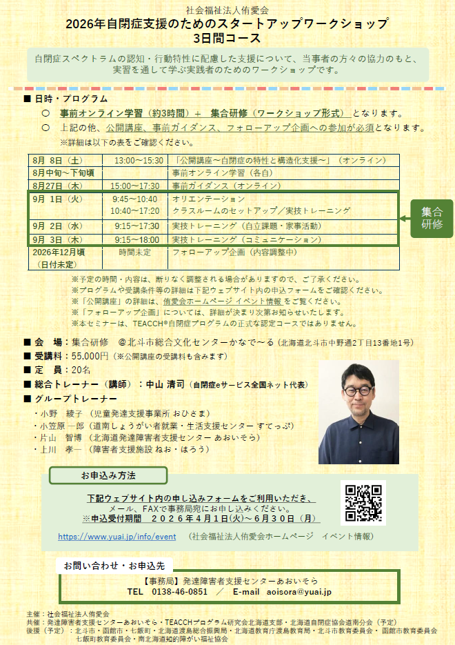 | 対象者 | 北海道内の保育園、幼稚園、こども園、学校、福祉事業所等で、直接、支援にあたっている支援者 |