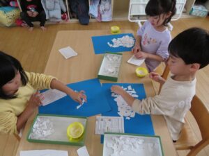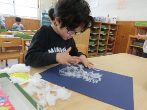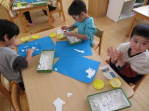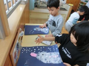 白い画用紙を自分でちぎってから、台紙に貼っていきます。