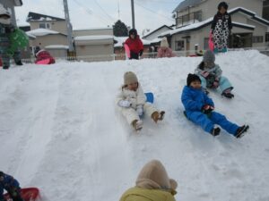 雪山では、自分たちで滑り台を作って雪玉を転がして遊んでいました✨