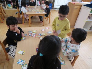 かるたのルールを確認しながら先に取った友だちを教えてあげたり、