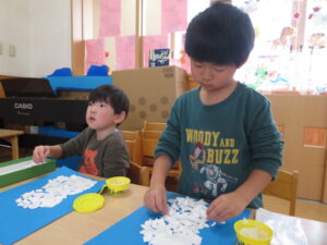 雪だるま製作は、顔を描いたりまだ貼り足りないところを貼ったりと頑張っています🎵