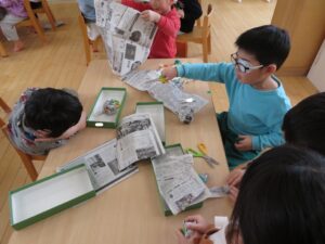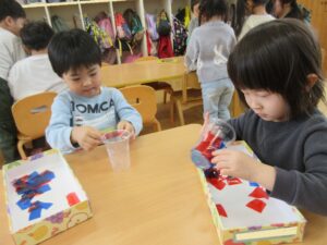 カラーセロハンと透明コップを組み合わせて鬼を作っています👹