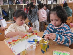 染め紙は、どんな色でつけるとかわいくなるか考えながら色をつけています🎵