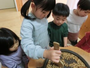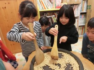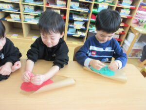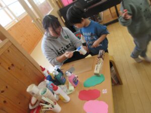 鬼の小物入れが完成し、今日はお面作りをしています!!