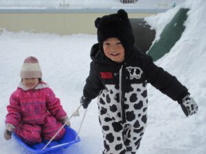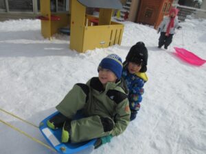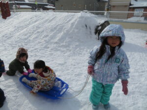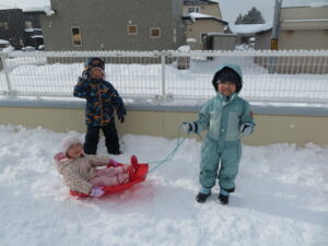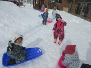 1歳児のお友だちと一緒に遊びそりで引っ張ってあげたり、