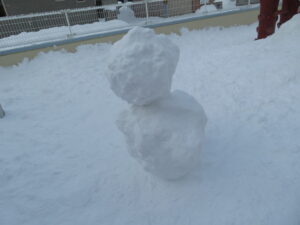 小さな雪玉から作り上げた大きな雪玉を「重い!」と言いながら