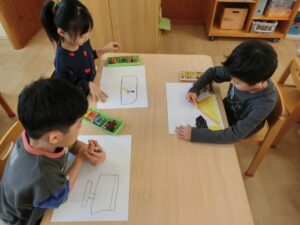 朝の会のあとは、“お休みの間、一番楽しかったこと”をテーマに絵を描きました!