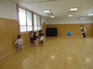 後半はホールに行き、マラソンと転がしドッチボールをして楽しく体を動かしています!!