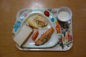 食パン、ミルク、鮭のムニエル、