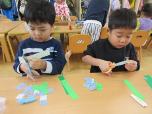 真剣な表情ではさみと折り紙をよく見て切っています!