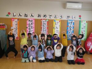 その後は七重浜こども園みんな揃ってしんねんおめでとうかい!!