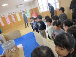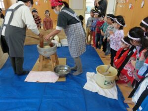 「よいしょ!よいしょ!」とたんぽぽさんの餅つきを見学し、