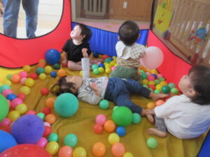 ボールテントの中で、天井の穴から落とされるカラーボールを