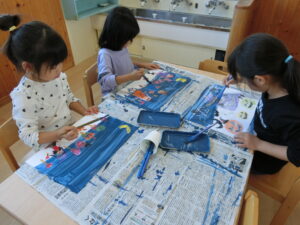 絵の具チームは綺麗な塗り方を教えてもらいながら、