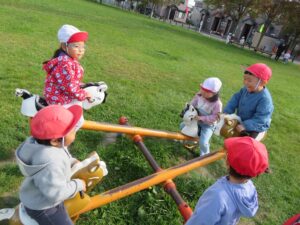 公園では、滑り台やブランコ、シーソーなどの遊具で遊んだり、