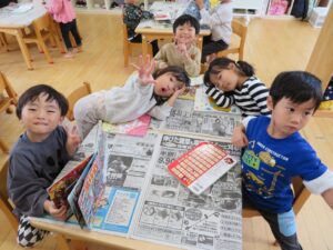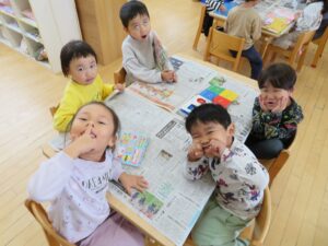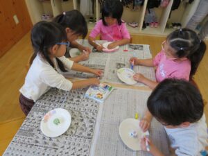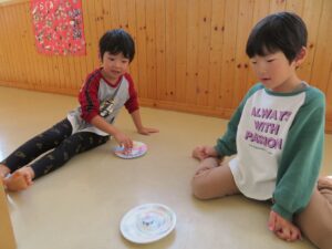 シールを貼って飾りつけし完成後はお部屋や廊下でたくさん回して遊びました。
