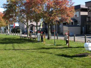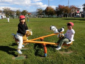 鬼ごっこをして元気いっぱい走ったり、とっても高くブランコをこいだり、木の実を集めたり、滑り台やシーソーの遊具も楽しんでいます!