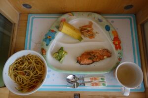 とりごぼうパスタ、白菜のスープ、鮭のムニエル、
