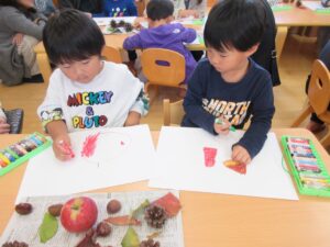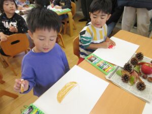 秋の食べ物、松ぼっくり、栗、イチョウの葉や枯れ葉の絵を描きました🖍
