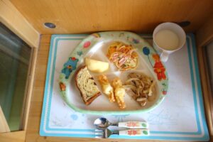 ぶどうパン、ミルク、豚肉と玉ねぎのソテー、