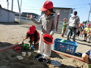 砂場遊びではお水をバケツに入れて遊んでいる子や、
