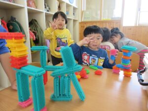 お部屋では、積み木をカルタに見立てて遊んだり、ペタペタブロックで動物や恐竜を作って戦いごっこをして楽しんでます😊