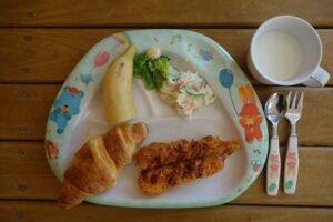 クロワッサン、ミルク、えびフライ、ポテトサラダ