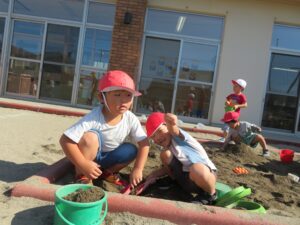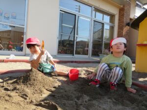 砂場チームはお山を作っていたり、隣の家でお店屋さんごっこをして楽しんでいました🎵