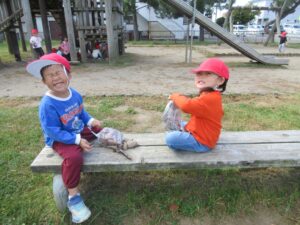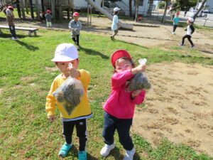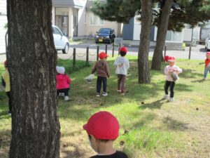 グラウンドの外にある草原で松ぼっくりや落ち葉を見つけて遊んでいます🍁