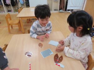 「ここにつけようかな」「かわいいね」と見せ合いながら貼っていました。