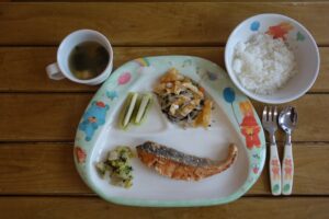 ご飯、みそ汁、鮭の竜田揚げ、白菜の海苔和え、