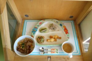 ペッパーランチ風丼、みそ汁、チーズスティック、