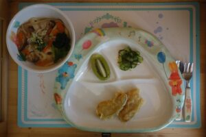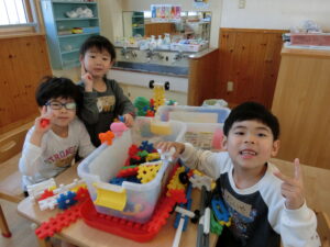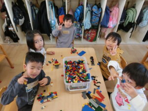 色水が入った積み木をスポンジ、細長いカラー積み木をフルーツに見立てて組み合わせケーキを作って遊んでいるお友だち、メルちゃん人形を床に寝かせて「おひるねだよ~」と先生になり切って遊んでいるお友だちなど見立て遊びやごっこ遊びがとても上手なちゅうりっぷ組さんです(*^-^*)