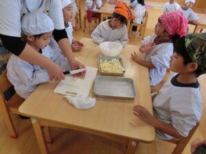 ばら組は、大根をたんぽぽさんが切ったと伝えると