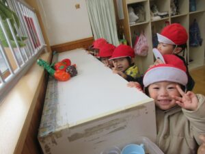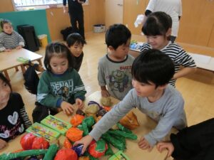 下ごしらえをした後は、手作り野菜を小さいクラスのお友だちにお届けに…🎵