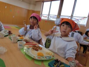 今日はたんぽぽ組のみんなが収穫祭で作ったおにぎりと豚汁が!!