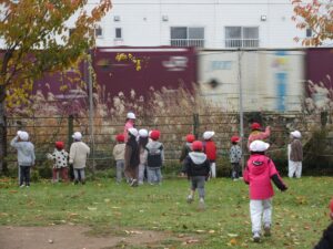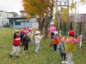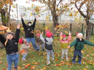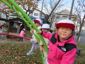 落ち葉をかき集めて投げあったり、鬼ごっこや滑り台で遊んだりとたくさん体を動かしているうちに「暑くなってきた」といつの間にか体はポカポカになっていました😆