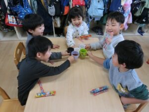朝の会では「お菓子美味しかった~」「いっぱい頑張ったからお寿司食べに行ったんだよ~」とお家の人に褒められて嬉しかったお話をたくさん聞かせてくれました(*´▽`*)