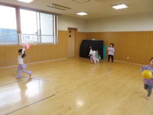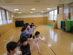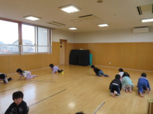 ホールでは、保育者の出すお題にあった動物などの動きをして