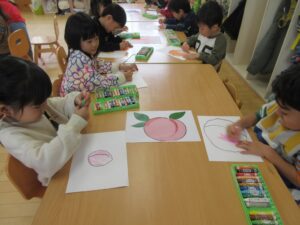 見本の果物のイラストを見ながら、色や形を真似てクレヨンで描きました🖍