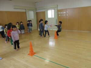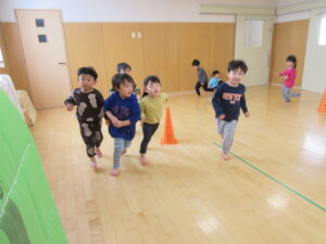 バトンを渡す時に「はい!」「〇〇ちゃん!」と大きな声で次のお友だちにバトンを渡し、応援席も「がんばれー」と大盛り上がり✨