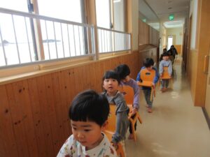 椅子の持ち方を教えてもらい、お友だちにぶつからないよう慎重に並んでいます😊