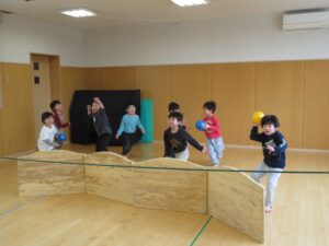 真ん中にロープを引いて、その上を超えるようにボールを2チームに分かれ交互に投げました。
