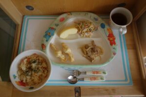 ピラフ、お茶、豚肉とたまねぎのソテー、