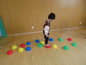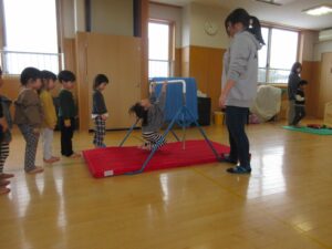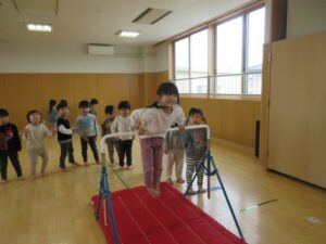 スキップやマット運動、バランスストーン、鉄棒などに挑戦!鉄棒はぶら下がるだけでなく、前回りに挑戦するお友だちも多かったです!