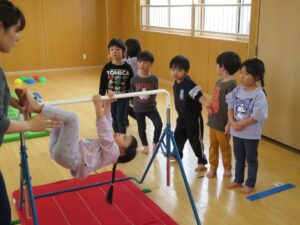 補助がなくても後転、逆上がりができる子を見て「すご~い✨」とみんな一生懸命チャレンジ!
