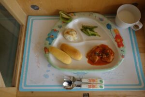 にんじんパン、ミルク、鶏肉のトマト煮、